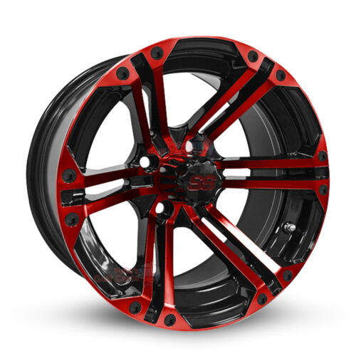 If you are looking for a quality set of new 14″ RX354 Black / Red golf cart wheels or just an individual replacement assembly you have come to the right place. The RX354 is modeled after the popular Terminator golf cart wheel design. Featuring 14″x7″ sizing, ET-25 backspacing, and 4×101.6mm (commonly referred to as 4×4) lug pattern, this will fit all common golf cart models.