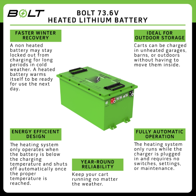 Bolt Energy 72V 105Ah Lithium Golf Cart Battery Kit for Club Car DS, Onward, Precedent, Tempo, Villager | 73.6V, 105Ah Heated Battery with Standard Install Kit