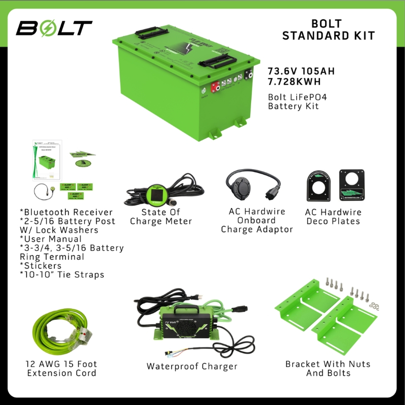 Bolt Energy 72V 105Ah Lithium Golf Cart Battery Kit for Club Car DS, Onward, Precedent, Tempo, Villager | 73.6V, 105Ah Battery with Standard Install Kit