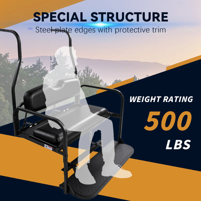 Our Club Car DS rear seat kit will quickly convert your 1982-2000 golf cart into a four-passenger machine. Our rear seat kit is easy on your wallet and adds functionality to your golf cart! This Club Car DS Rear Seat works for carts manufactured between 2000.5-2013. The comfortable black seat cushions are made of quality foam wrapped in marine-grade vinyl that are durable against the elements and UV resistant. Installing in a matter of hours, you will have your family riding on the back of your cart comfortably in no time! Pile the family on the back of your cart and head to the beach, around the campground, or to the soccer game.