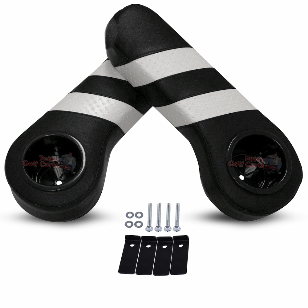 Golf Cart Rear Seat Arm Rest Cushions with Cup Holders – Black with White Stripes (Set of 2)