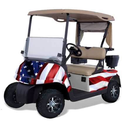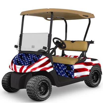 Customize your Club Car or Ezgo golf cart with this Stars n Stripes Golf Cart Graphics Kit . This Golf Cart Graphics Kit is the finishing touch to your new golf cart. Set your cart apart from the pack. Be the envy of your neighbors and a hit with all the kids once you wrap your cart with this awesome looking golf cart graphics kit. All of Pete’s Premium Graphics are produced to order and may take up to 5 business days to manufacture. All of our golf cart graphics are digitally printed with UV resistant inks that are guaranteed not to fade for years to come. These are not plain vanilla 3 or 4 color silk screen stickers. All of our designs are cutting edge ( No pun intended… ) with the use of the latest digital technology to produce extremely vivid images with millions of colors! All of our golf cart graphics come with the thickest layer of scratch-proof clear vinyl available. Placed over like laminate for an Armor Like layer of protection. Not to be confused with others offering custom graphics all our graphics kits use Genuine 3M brand adhesive which assures our graphics won’t ever be peeling off unless you want them to. “The THICKEST – TOUGHEST GRAPHICS ON THE PLANET”