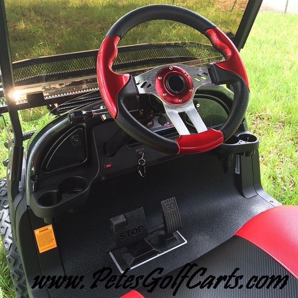 This 13 Inch Black and Red Golf Cart Steering Wheel will FIT ALL Club Car Ezgo Yamaha golf carts with proper adapter Hub. Easy installation. Our 13″ inch custom steering wheel in Black and Red will give your Golf Cart the look and feel you have been searching for. The unique design provides a nice touch and feels great in your hands. Taking your evening cruise to the next level. Another great benefit is the upgraded appearance that will make your interior stand out. The black finish adds that sleek sports car appeal while the blue will match trim or custom paint. Count on Pete to provide the best in golf cart parts and accessories.