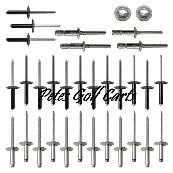 This Ezgo Golf Cart Complete Body Rivet Kit Includes all rivets needed to re-body/mount the TXT body on your cart. Gas or Electric 1994 and Up
